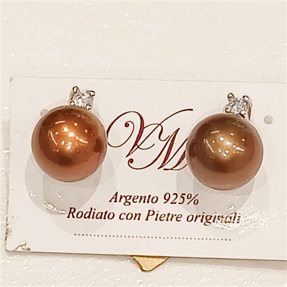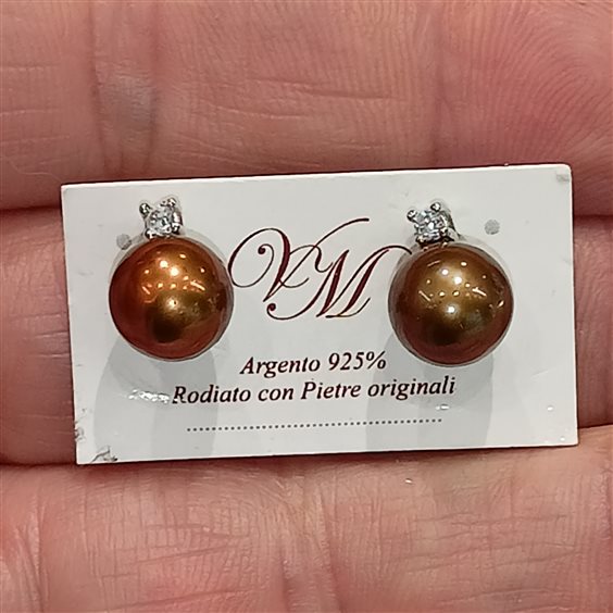 ELEGANTI ORECCHINI AL LOBO CON PERNO E FARFALLA IN ARGENTO, PERLA SFERICA DI COLOR AMBRA E DUE PICCOLI ZIRCONI ALLA BASE INCASSATI A GRIFFE.