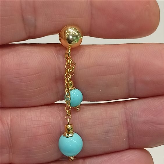 ELEGANTI ORECCHINI IN ARGENTO DORATO CON DUE CATENINE PENDENTI E ALLA BASE DUE PICCLE SFERE IN TURCHESE.
