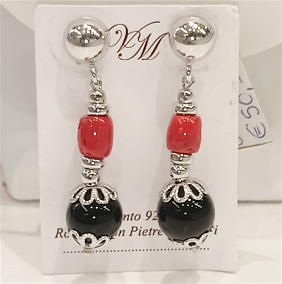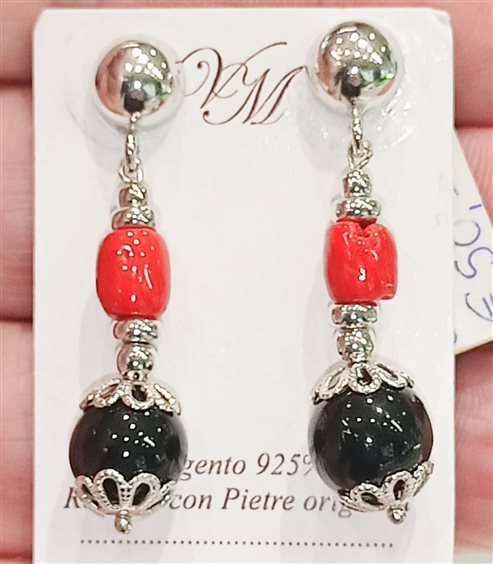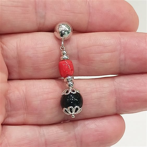 ELEGANTI ORECCJINI IN ARGENTO PENDENTI CON PIETRE SFERICHE DI ONICE E OVALI DI CORALLO ROSSO.