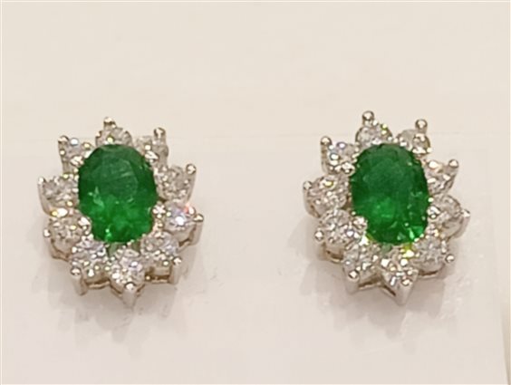 ELEGANTI ORECCHINI A LOBO IN ARGENTO E ZIRCONI, PIETRA CENTRALE ZIRCONE COLOR VERDE E CONTORNO COLOR BIANCO TUTTO INCASSATO A GRIFFE.