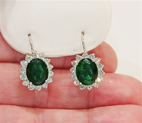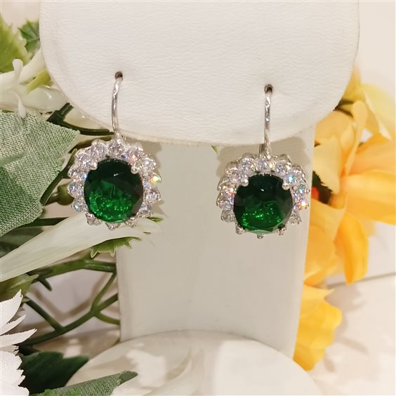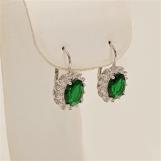 ELEGANTI ORECCHINI IN ARGENTO CON PIETRA CORINDONE VERDE, ZIRCONI BIANCHI A CONTORNO, INCASSATI A GRIFFE. GANCIO A MONACHELLA.