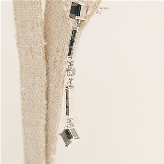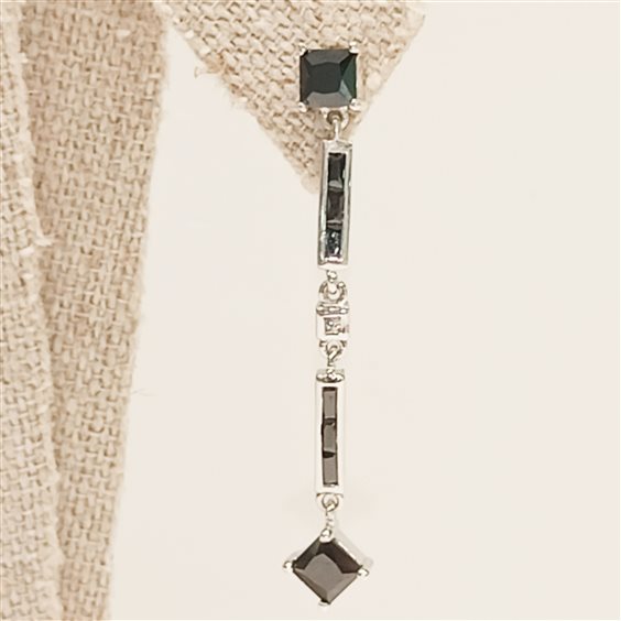 ELEGANTE ORECCHINO PENDENTE IN ARGENTO E PIETRE COLORE NERO TAGLIO QUADRATO INCASSATE A GRIFFE AL LOBO E NEL FINALE DELL'ORECCHINO,TRA QUESTE DUE PIETRE DUE BINARI IN ARGENTO CON PIETRE NERE INCASSATE A FILO.