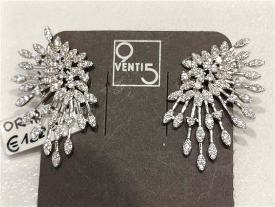 ELEGANTE E PREZIOSI ORECCHINI IN ARGENTO E ZIRCONI COLORE BIANCO, TAGLIO BRILLANTE INCASSATI A GRIFFE. FANTASIA A CODA DI PAVONE. PERNO E FARFALLINA