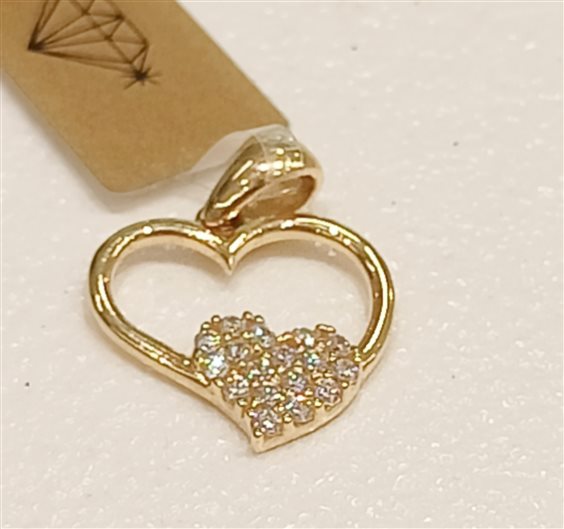BELLISSIMO PENDENTE IN ORO GIALLO A FORMA DI DOPPIO CUORE APERTO CON PICCOLO CUORE SUL FONDO CON ZIRCONI INCASSATI A GRIFFE.