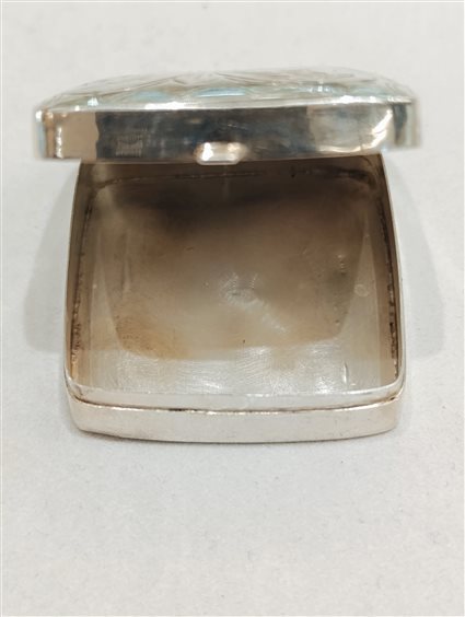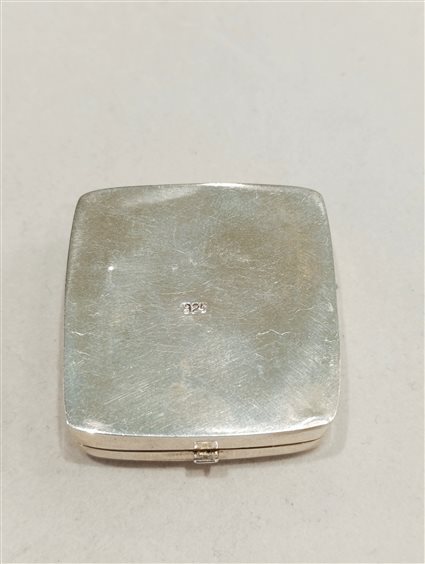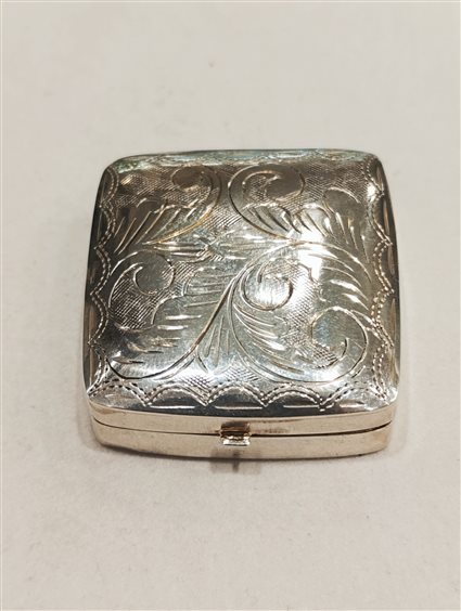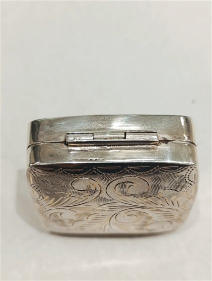 PREZIOSA ED ELEGANTE SCATOLETTA PORTA OGGETTINI/PASTIGLIE IN ARGENTO CON INCISIONE SUL COPERCHIO,CERNIERATA AD UN LATO.