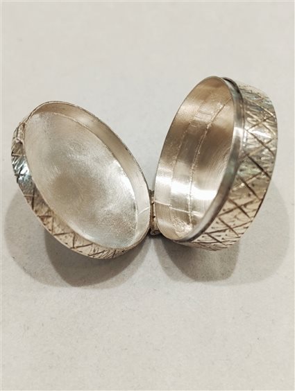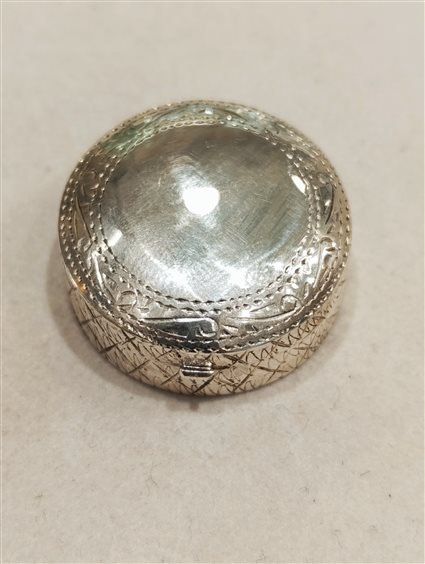 PREZIOSA ED ELEGANTE SCATOLETTA PORTAPASTIGLIE IN ARGENTO INCISA SUL COPERCHIO, CERNIERATA E CON CHIUSURA A SCATTO.