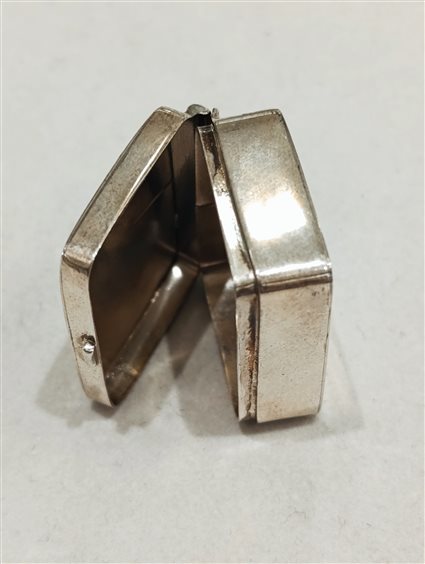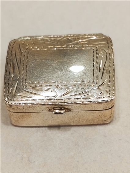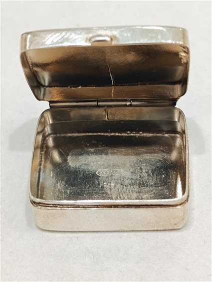 PREZIOSA ED ELEGANTE SCATOLETTA PORTAPASTIGLIE IN ARGENTO INCISA SUL COPERCHIO, CERNIERATA E CON CHIUSURA A SCATTO.