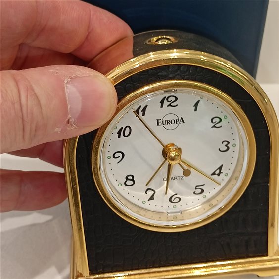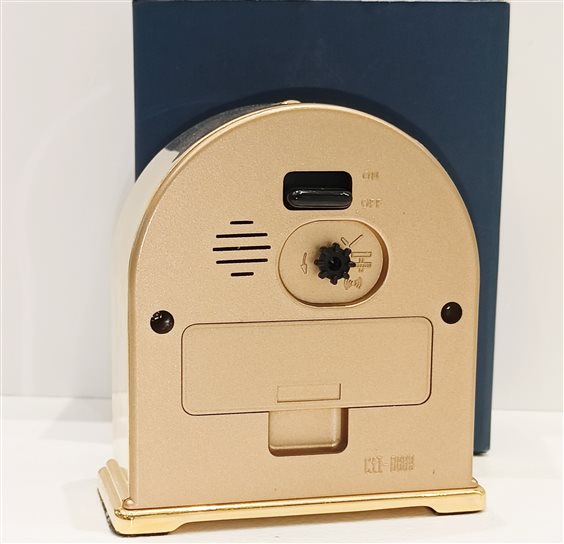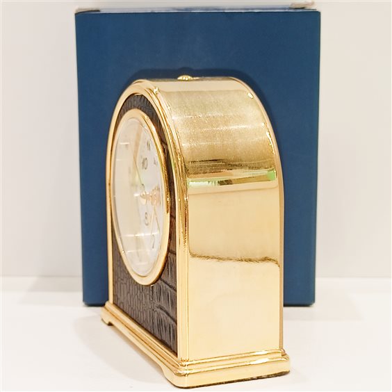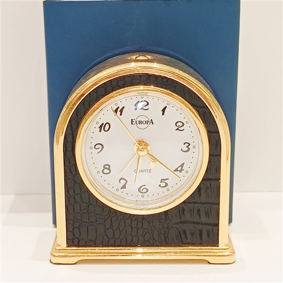 ELEGANTE SVEGLIA DA TAVOLO VINTAGE MARCA EUROPA IN ACCIAIO COLORE ORO GIALLO E NERO, CON QUADRANTE BIANCO, SFERE ORA,MINUTI E SECONDI