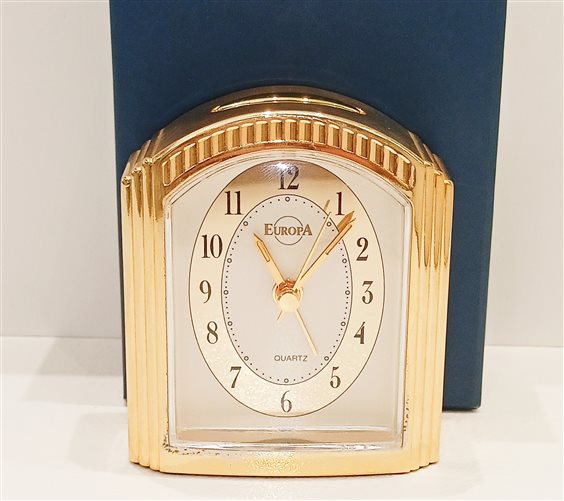 SVEGLIA VINTAGE DA TAVOLO MARCHIO EUROPA IN ACCIAIO COLORE ORO. SFERE ORA E MINUTI, QUADRANTE CHAMPAGNE.