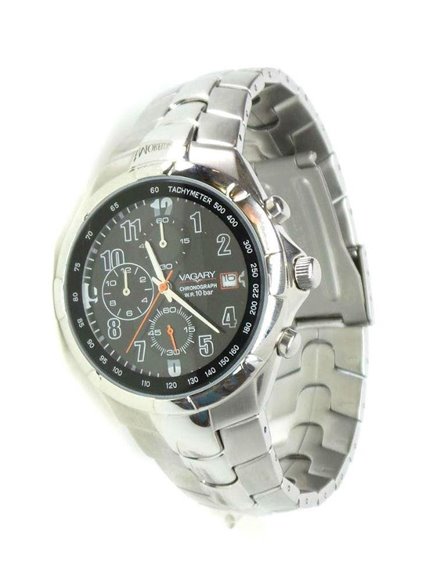 CRONO ACCIAIO VAGARY BY CITIZEN LEGGERO ROBUSTO , VETRO MINERALE, PANORAMICO. ALTA LEGGIBILITA', DATARIO, 100 METRI WR, FONDELLO A VITE. QUADRANTE NERO CON ELEMENTI CROMATI CASSA TOTALMENTE I ACCIAIO CON PROTEZINE DAGLI URTI PER LA CORONA. DATA.
