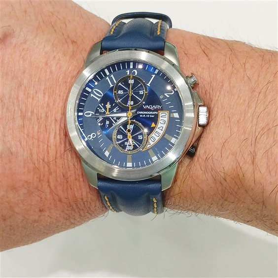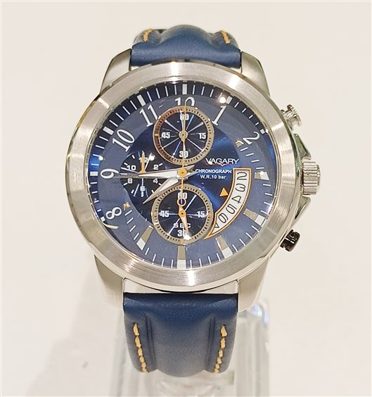 stupendo orologio in acciaio vagary chrono uomo, vetro bombato ad effetto lentesfere luminescenti colori sportivi e un classico blu che non stanca mai. leggero robusto.