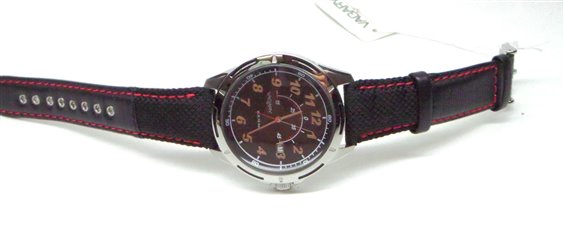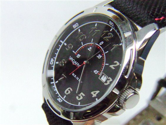 Vagary uomo/ragazzo con movimento al quarzo, cassa in acciaio mm 41, datario al 3. Cinturino in tessuto nero con inserto finale in pelle, cuciture rosse e fori di regolazione in acciaio. Quadrante con lunetta tachigrafica e quadrante interno di controllo secondario, look carbonio.