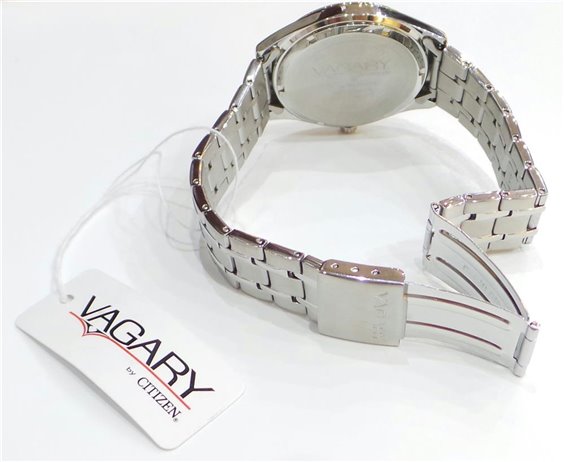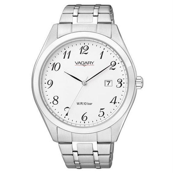 Orologio da uomo con cassa in acciaio mm 40 , quadrante bianco con numeri arabi neri , datario al 3 e corona a pressione . Fondo WR 10 atm e cinturino in accaio satinato-lucido . 2 anni di garanzia . Vagary by Citizen .