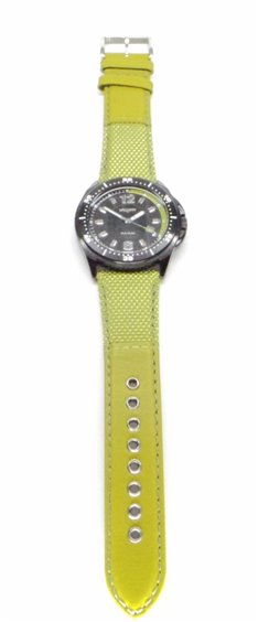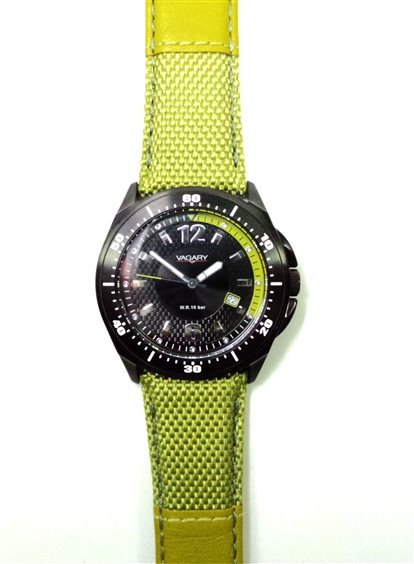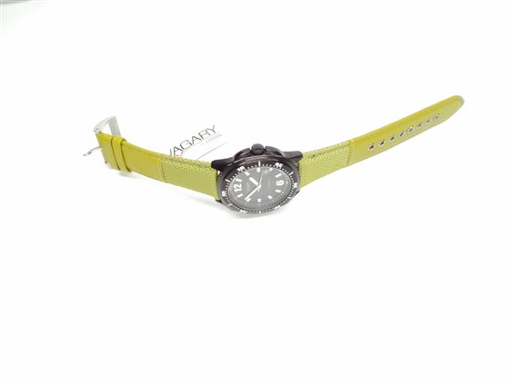 OROLOGIO CASSA NERA E QUADRANTE NERO IN ACCIAIO LUNETTA VERDE CINTURINO TECNICO VERDE.