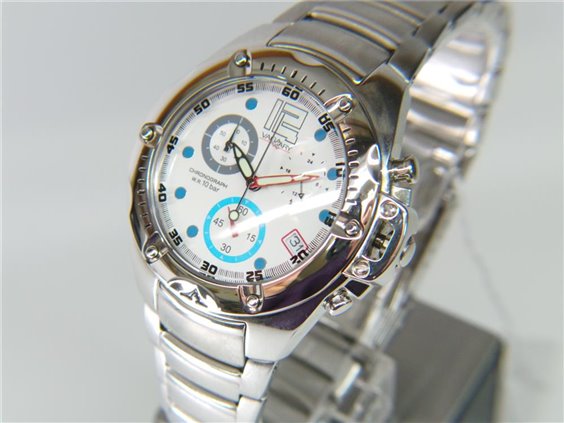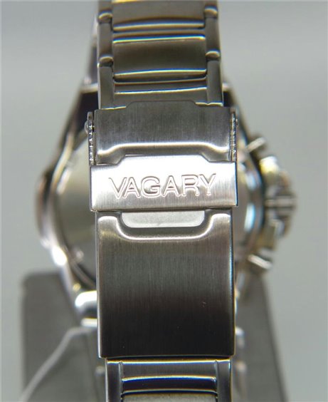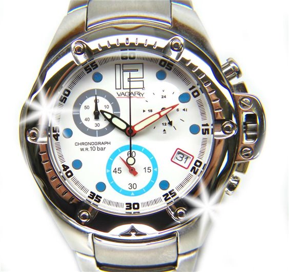 Orologio Vagary by Citizen cronografo misura MIDI. Cassa in acciaio di diametro 38 mm. Quadrante bianco. Vetro minerale panoramico ingrandente, impermeabile fino a 100 MT, Corona girevole a vite, Look essenziale ed accattivante, Fondello a vite. Cinturinoin acciaio con sicura e logo VAGARY. Indicazione minuti e ore CICLO 24 ORE DATARIO. Ideale da bambino per il classico regalo primo orologio.
