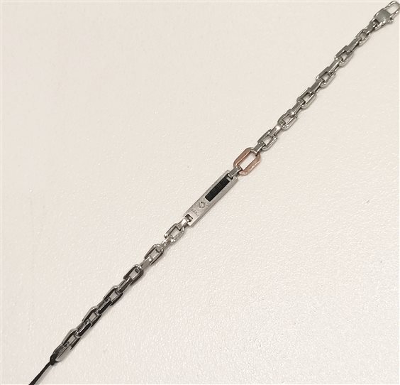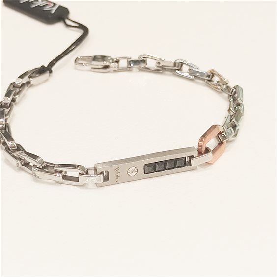 MODERNO BRACCIALE DA UOMO IN ACCIAIO A CATENA LARGA E PIASTRA SATINATA CON PARTICOLARI IN CRISTALLI COLOR NERO E ZIRCONE BIANCO.