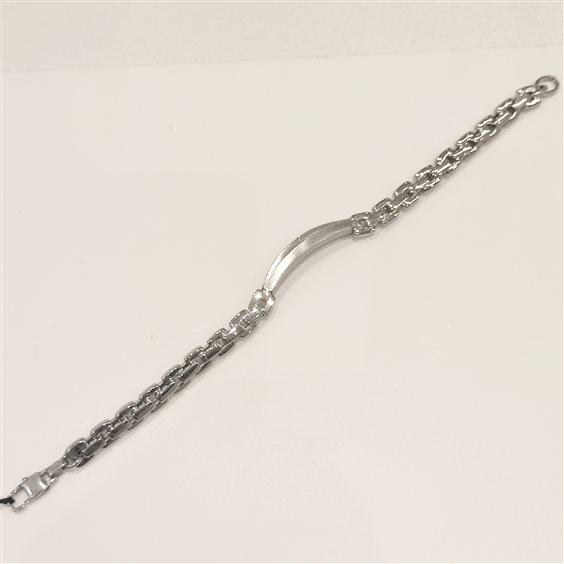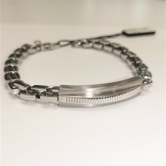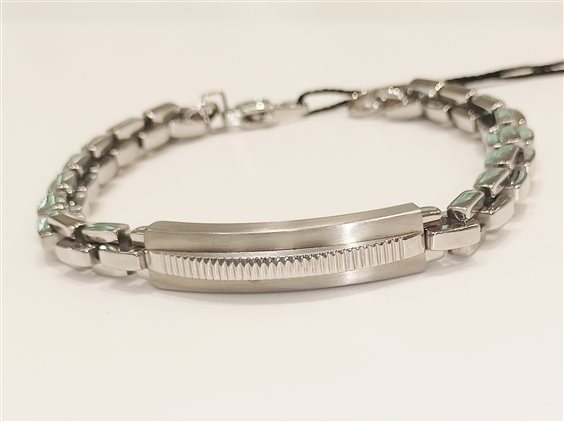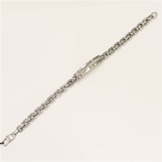 MODERNO BRACCIALE DA UOMO IN ACCIAIO LUCIDO CON TARGA LAVORATA E CATENA MAGLIA QUADRA.