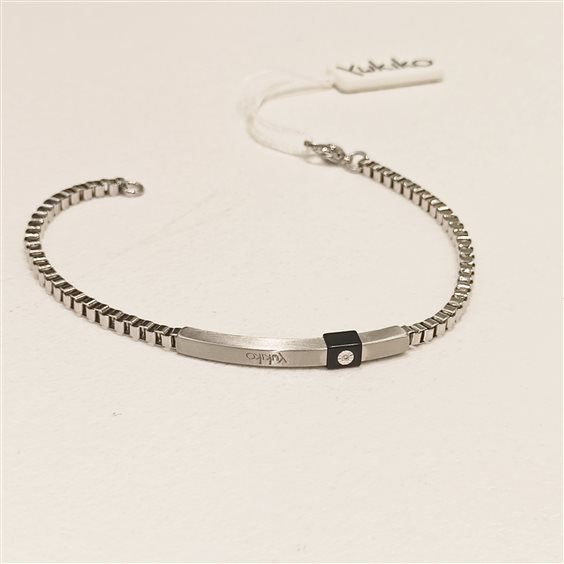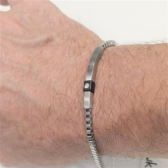 BRACCIALE IN ACCIAIO DA UOMO CON CATENA MAGLIA VENEZIANA E TARGA CON PARTICOLARE IN PVC NERO E PICCOLO ZIRCONE.
